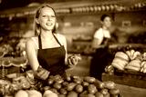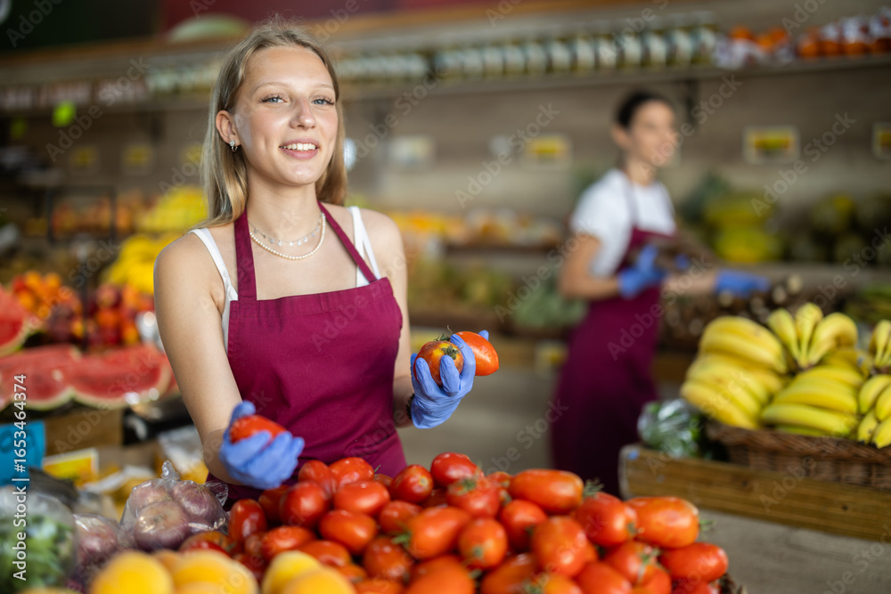 Young woman seller in apron puts tomatoes on display in vegetable shop