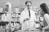 Experienced male pharmacist helping girl choose medicines in a pharmacy