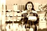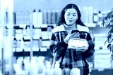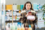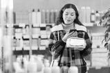Checking expiration date of feminine pads - female shopper scans QR code on label of feminine pads using her smartphone