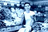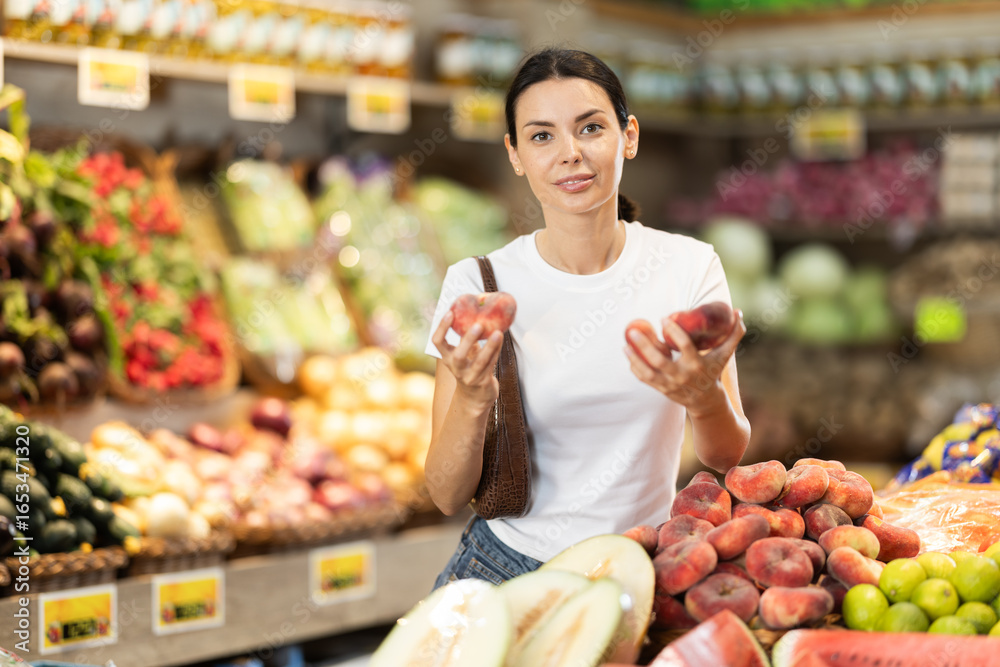 Woman near vegetable stand in store choose flat peach. Client view ripeness of fruit, take out fruits from showcase, collects grocery basket. Girl pull out ripest fruits from large pile of fruits.