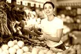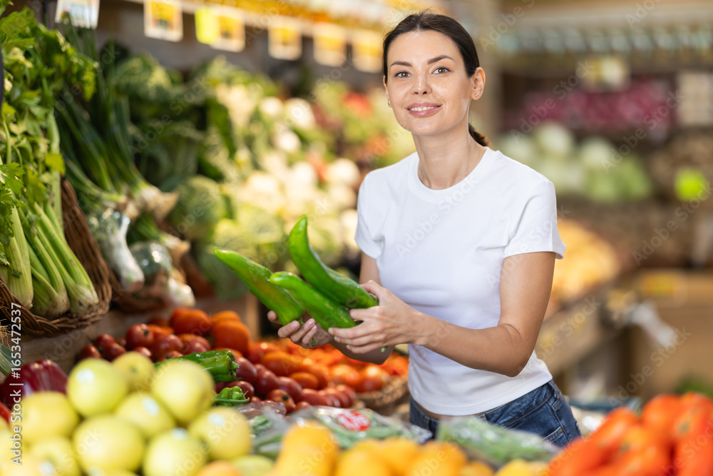 Adult woman buyer choosing fresh green peppers in vegetable shop