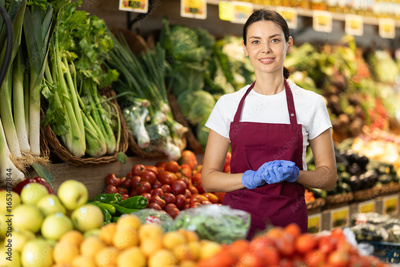 Portrait of a saleswoman in a supermarket who stands near a counter with vegetables and fruits. Grocery store owner invites customers to shop