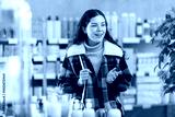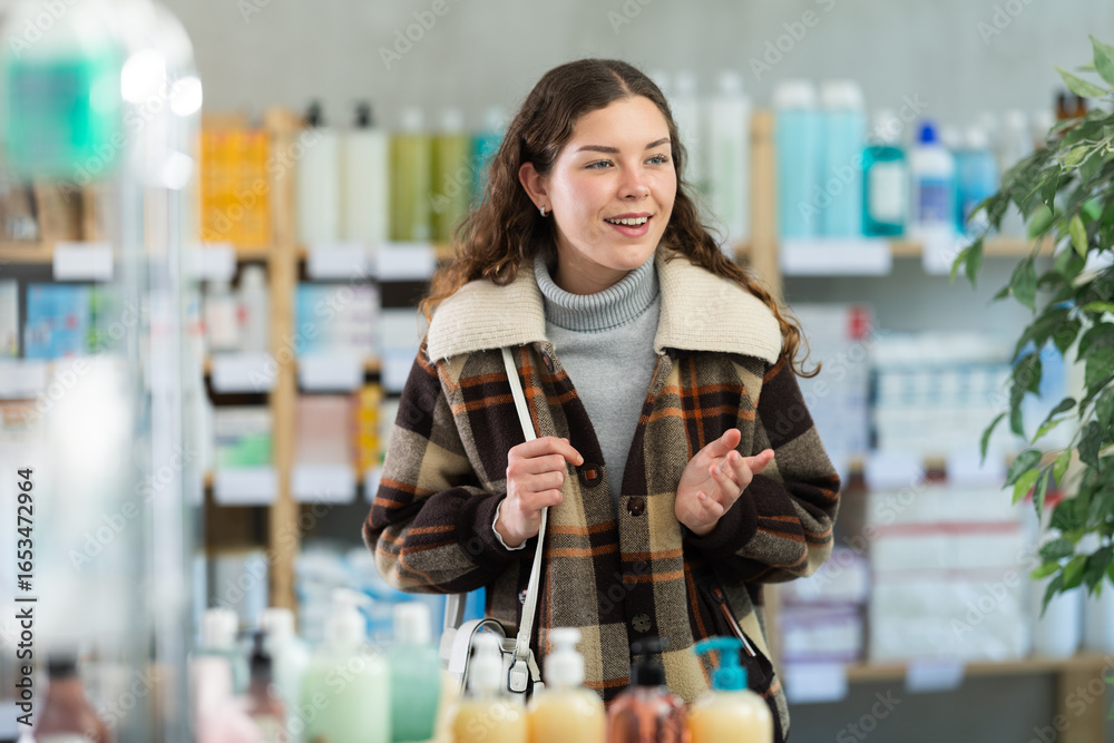 Young woman buyer choosing medicines and hygiene products in pharmacy