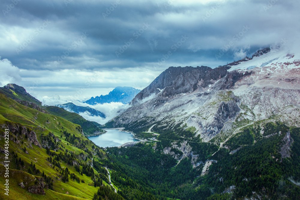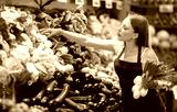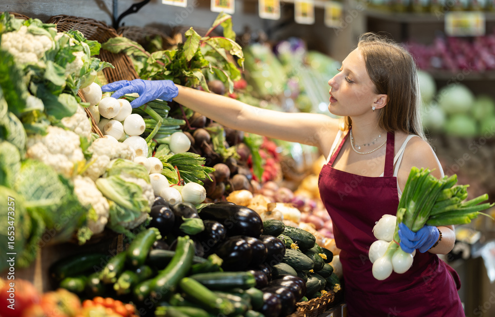 Woman vendor in a red apron is standing near a vegetable counter and laying out shallots. Farm shop worker distributing fresh vegetables
