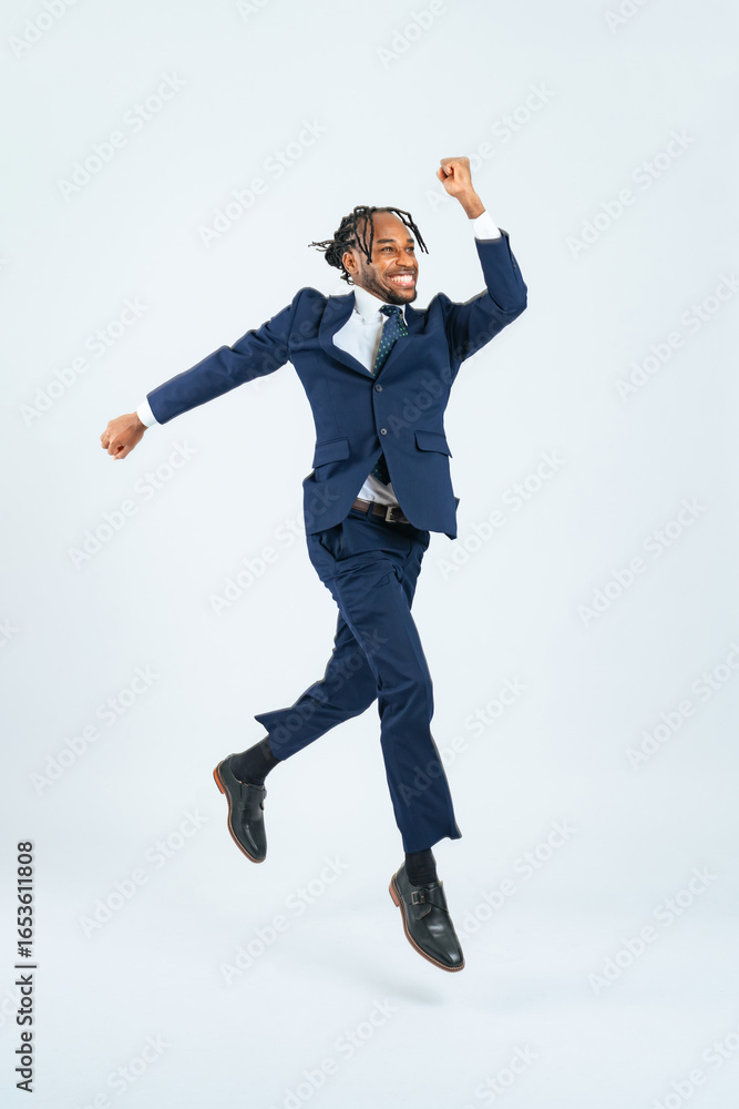 jump, running, businessman, man, business, action, black, multinational, multiracial, leap, dynamism, energy, smile, jump out, star, stuntman, fly, active, success, challenge, growth, goal, competitio