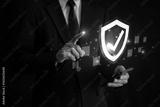Businessman using AI technology for cybersecurity protection ensuring secure data access and privacy compliance with advanced digital risk management solutions