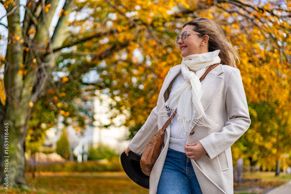 Portrait of beautiful mature woman in autumn scenery