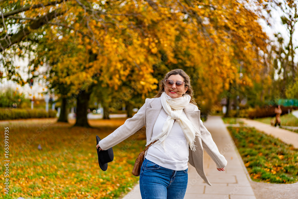 Portrait of beautiful mature woman in autumn scenery