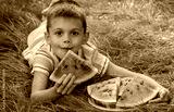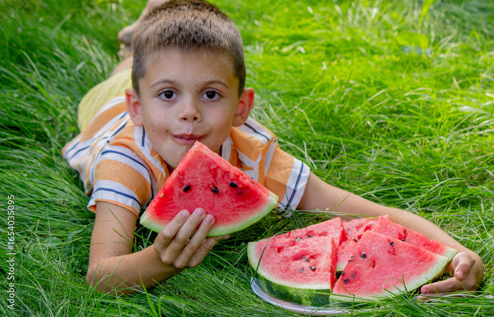 Happy child eating watermelon outdoors in summer grass