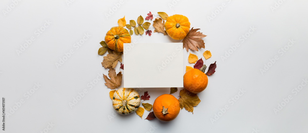 Autumn composition with paper blank and dried leaves with pumpkin on table. Flat lay, top view, copy space