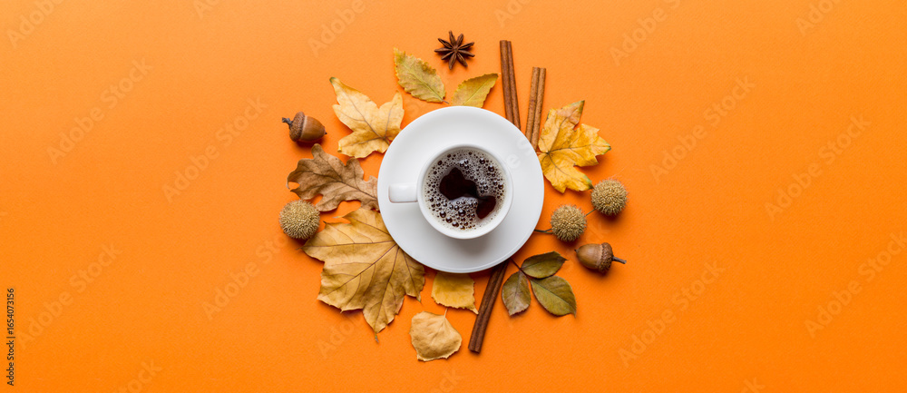Flat lay composition with colorful Autumn cup of coffee and leaves on a color background. top view