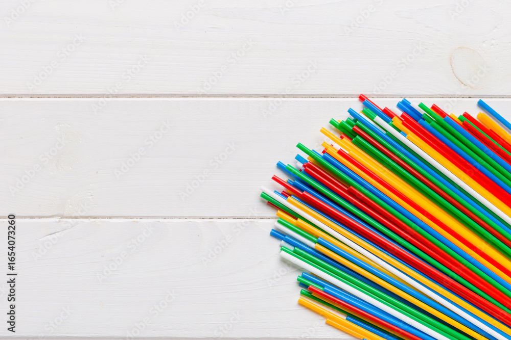 Heap of colorful plastic drinking straws on Colored background, flat lay. Copy Space for text