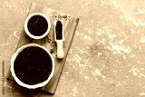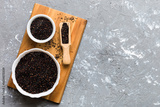 quinoa seeds in bowl and spoon on colored background. Healthy kinwa in small bowl. Healthy superfood