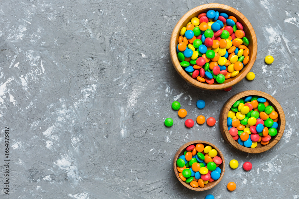 different colored round candy in bowl and jars. Top view of large variety sweets and candies with copy space