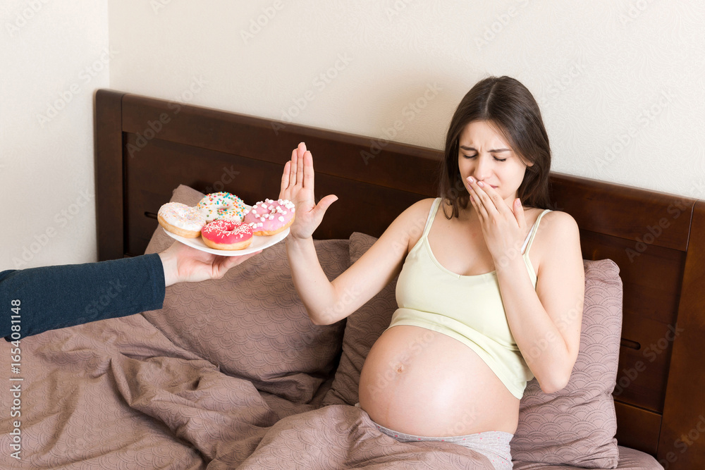 Pregnant woman staying in bed rejects to eat junk food such as donuts and makes no gesture. Healthy diet for future mother concept