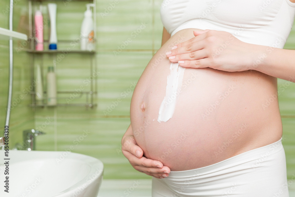 Young pregnant woman applying anti-stretch marks cream to the abdomen in the morning in the bathroom. Pregnancy, maternity and bodycare concept