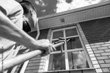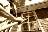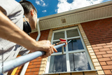 Worker cleaning house window with squeegee tool