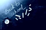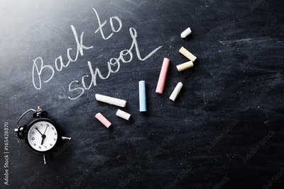 Back to school background on blackboard with colorful chalks and alarm clock.