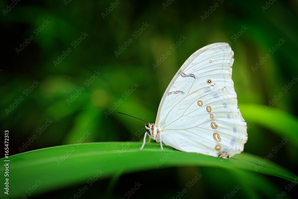 Morpho polyphemus, the white morpho, white butterfly of Mexico and Central America. Big white butterfly, sitting on green leaves, Mexico. Tropic forest. Insect in the nature tropic habitat.