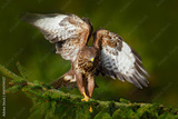 Bird of prey Common Buzzard, Buteo buteo, sitting on coniferous spruce tree branch. Bird hidden in the tree in dark forest. Wildlife scene from the nature. Landing ion spruce tree. Buzzard in fly.