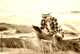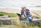 A man in smart casual hipster style with tablet combining work with relax on the beach of Baltic Sea