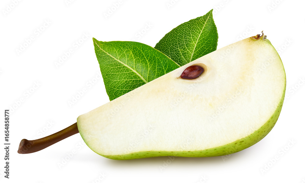Pear slice with leaves. Pear slice isolated on white background. Pear macro. With clipping path