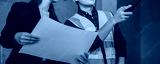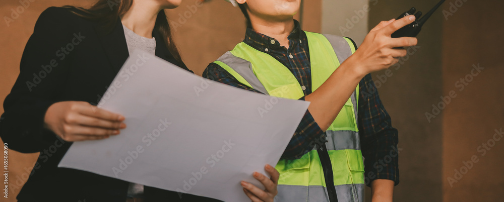 Construction manager and engineer dressed in orange work vests and hard helmets explore construction documentation on the building site near the steel frames