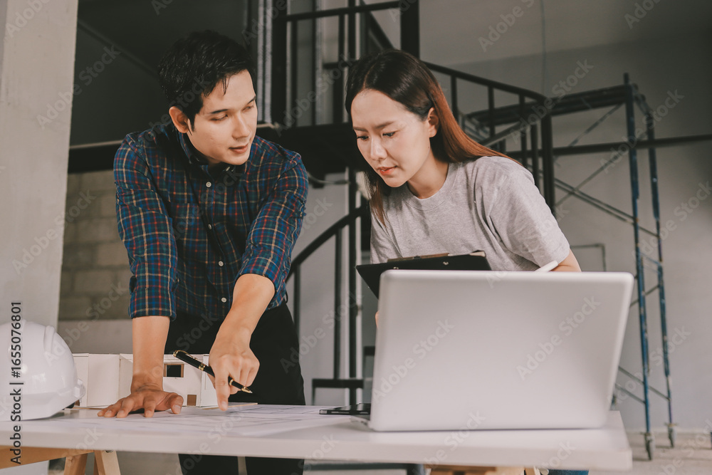 Construction manager and engineer dressed in orange work vests and hard helmets explore construction documentation on the building site near the steel frames