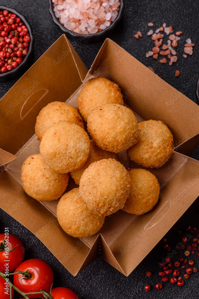 Cheese balls, croquettes or arancini with potatoes or rice. Cheese balls