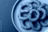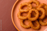 Onion rings or fried squid in breadcrumbs with sauce, takeaway food. Onion rings fried