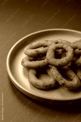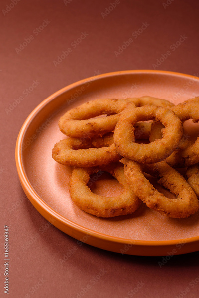 Onion rings or fried squid in breadcrumbs with sauce, takeaway food. Onion rings fried