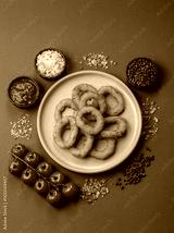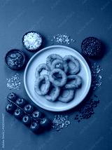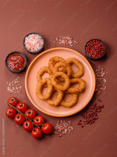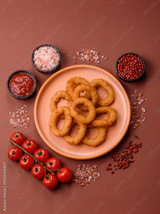 Onion rings or fried squid in breadcrumbs with sauce, takeaway food. Onion rings fried