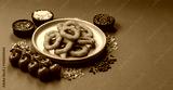 Onion rings or fried squid in breadcrumbs with sauce, takeaway food. Onion rings fried