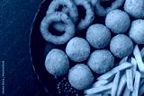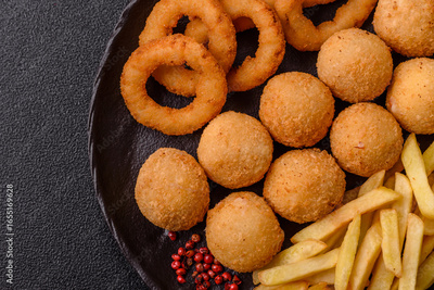 Fast food, cheese balls, onion or squid rings and French fries. Junk food as a background