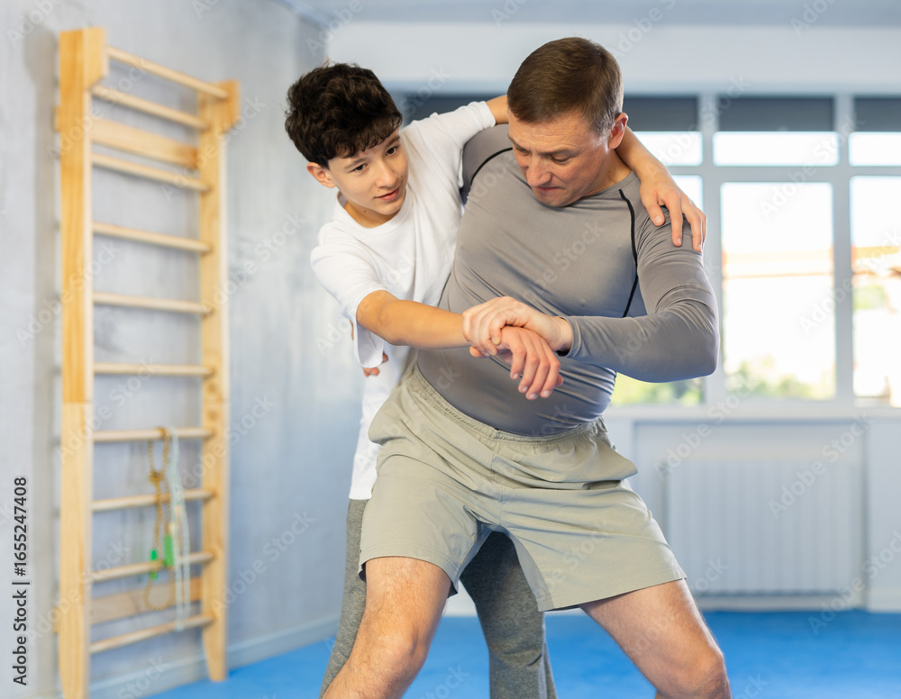Father teaching his son wrestling or self-defense techniques in the gym