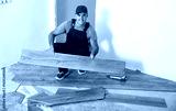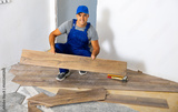 Cheerful man worker laying wooden parquet floor, working on home renovation.