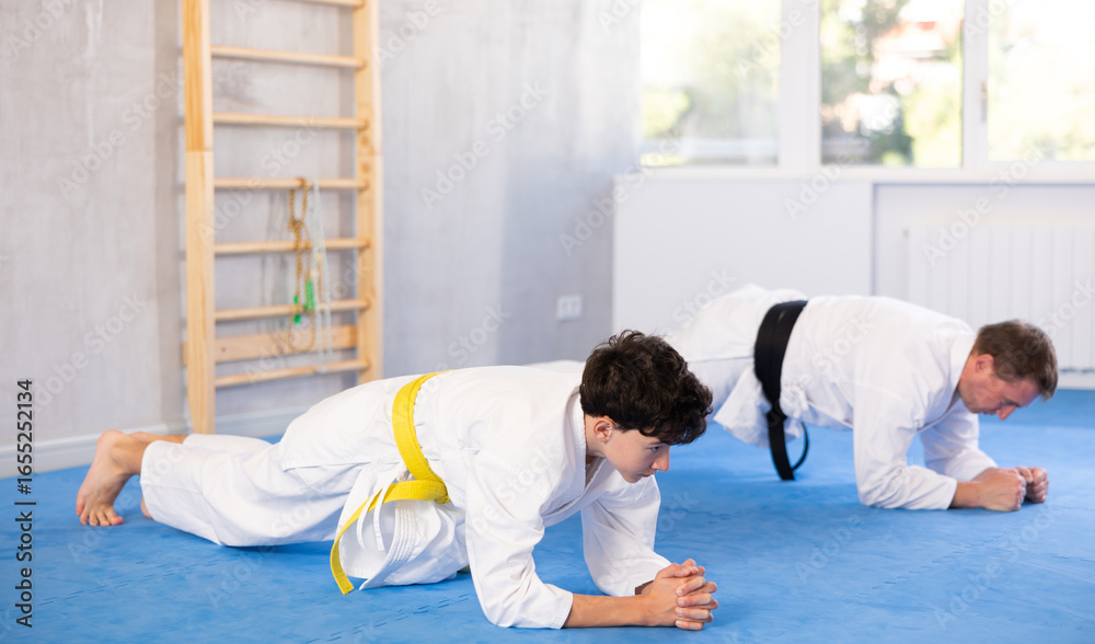 Dynamic middle-aged and teenage male attendees of karate classes practicing plank pose in sports hall