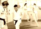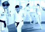Man in kimono and colored belt practicing karate punch block whith trainer during group martial arts lesson in gym