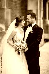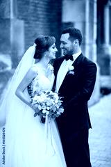 Classy wedding couple poses on the old European street