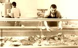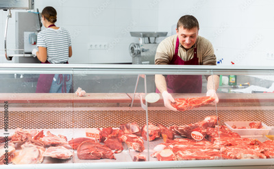 Butcher in an apron offers to buy fresh meat in the grocery store section