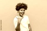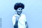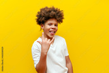 cheerful curly african american boy showing rock music gesture and tongue on yellow isolated background, teenager in white t-shirt showing heavy music symbol and grimacing