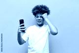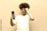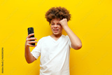 tired unhappy african american boy using smartphone and showing facepalm on yellow isolated background, curly schoolboy teenager losing online and making mistakes