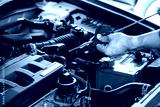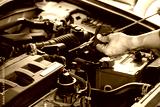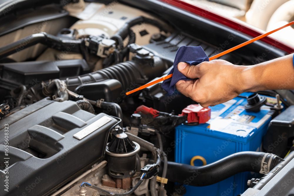 A mechanic's hand checks the engine oil level and he is about to change the engine oil