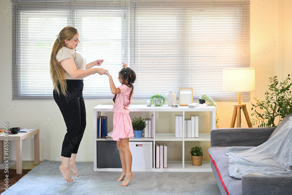 Happy mom and little girl holding hands and jumping playfully together in the living room