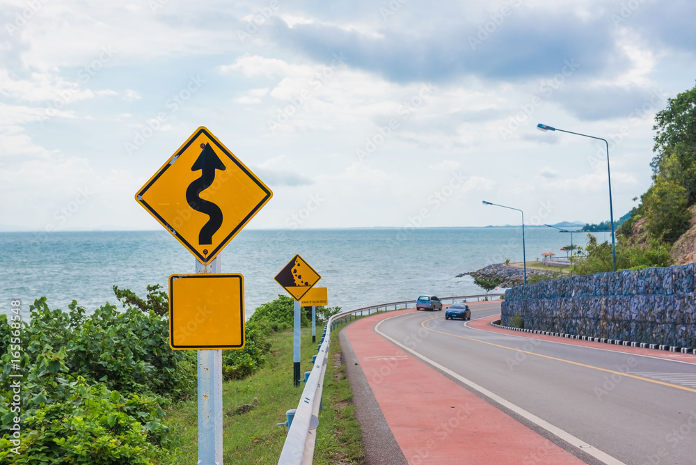 Yellow sign with winding road symbol in the countryside sea and sky background .