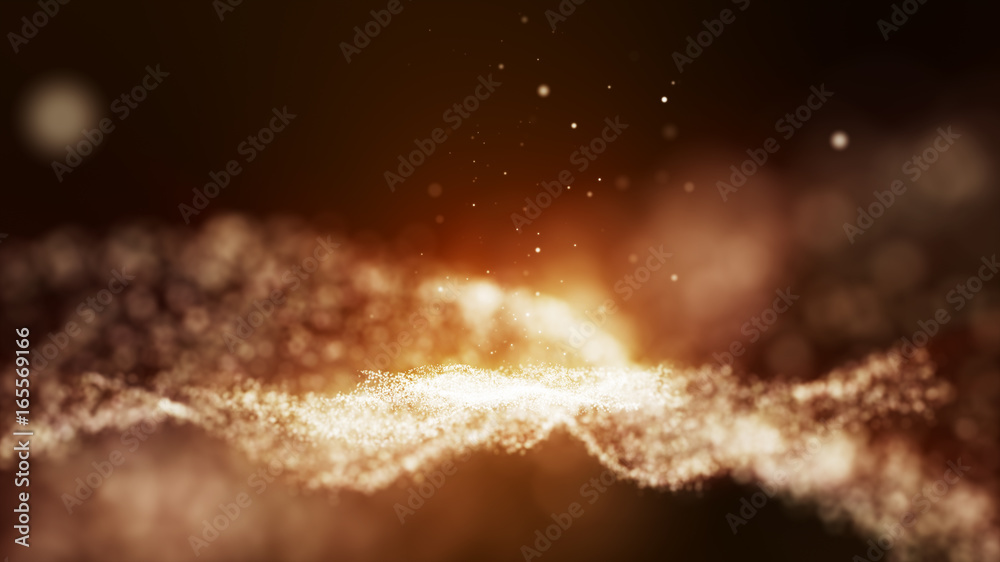 Dark gold yellow and glow particle circle abstract background with light ray effect.