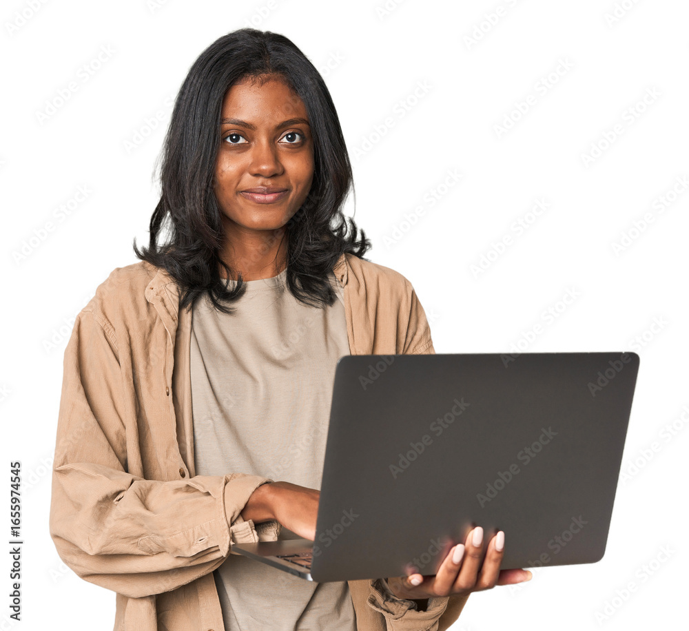 Cheerful young Indian woman holding a laptop in a studio setting