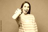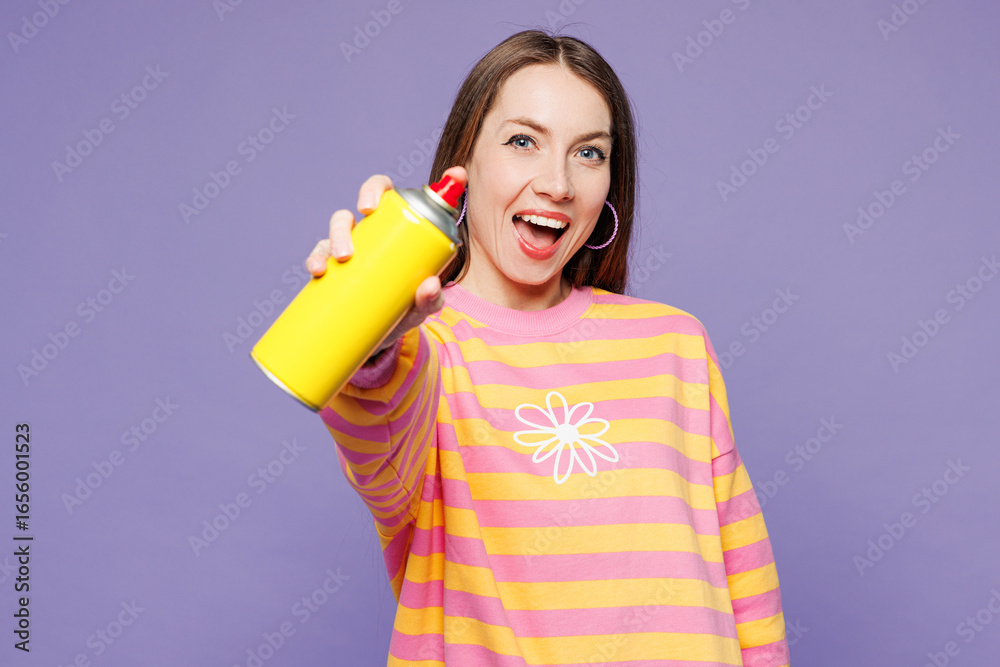 Young smiling happy woman she wears yellow sweatshirt casual clothes hold in hand spray paint stretch arm to camera isolated on plain pastel light purple background studio portrait. Lifestyle concept.
