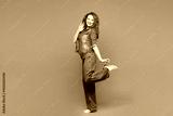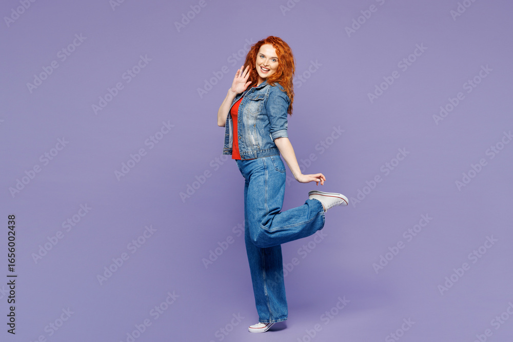 Full body side view young smiling ginger woman she wears red t-shirt denim shirt stand raise up eg put hand on face isolated on plain pastel light purple background studio portrait. Lifestyle concept.