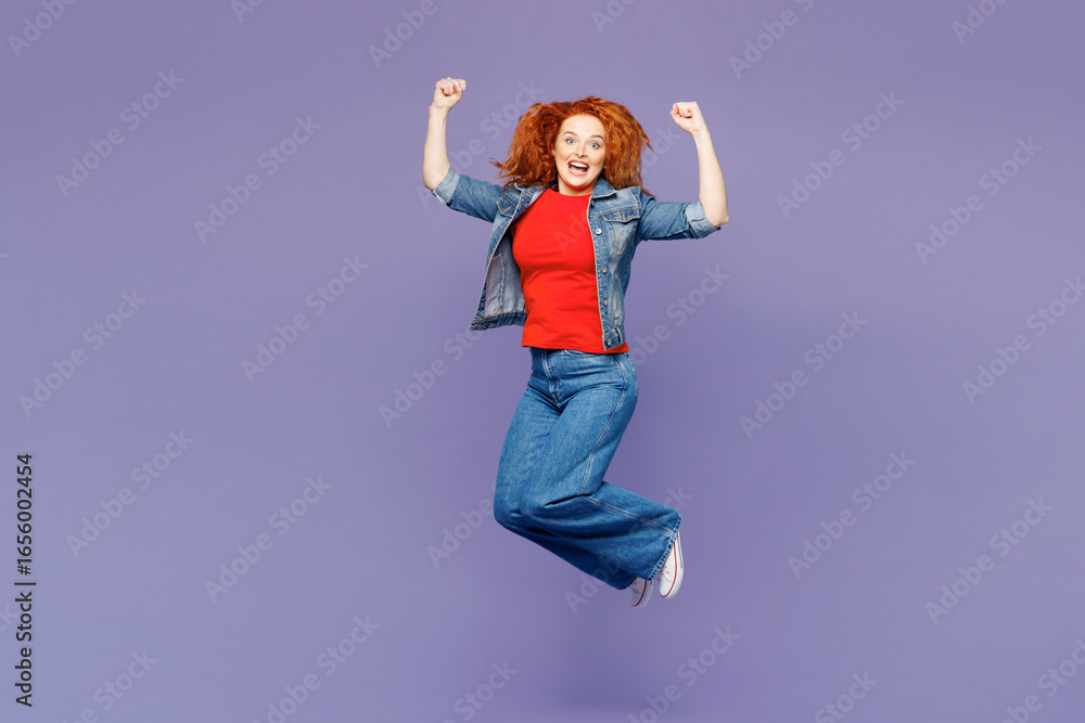 Full body young ginger woman she wearing red t-shirt denim shirt jump high doing winner gesture celebrate clenching fists say yes isolated on plain light purple background studio. Lifestyle concept.